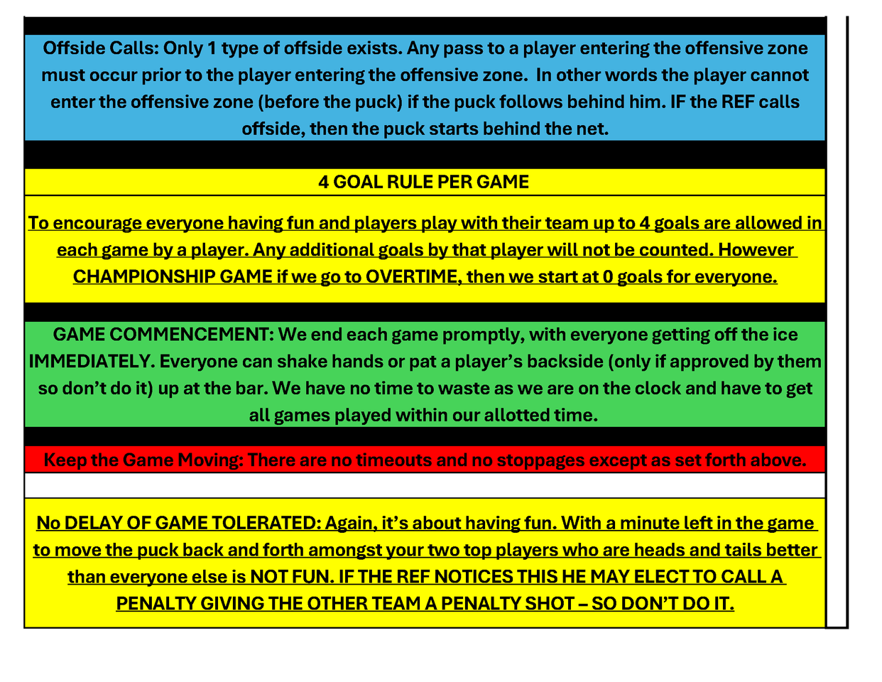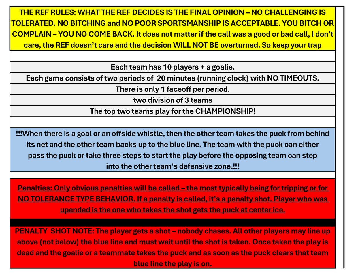 Championship Game: 11 AM on the North Rink (1,2,3 vs 4,5,6)